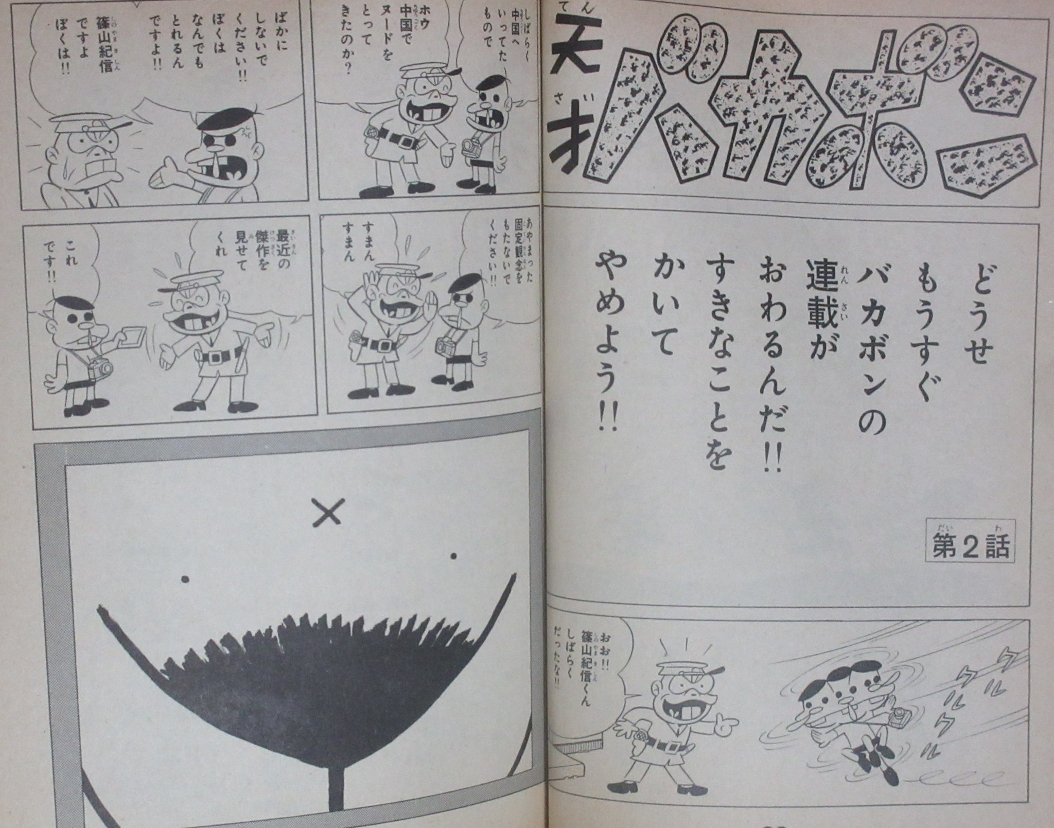 裏庭映画保存会 天才バカボン 赤塚不二雄 73年頃のバカボンは作者もモチベーションが尽き果て もうじき打ち切りになるから と毎週ひどかった 史上初の実物大漫画 文字で絵を表現 キャラが夏ヤセしたと胴体をマッチ棒の様に描いたりコマが所々空白に